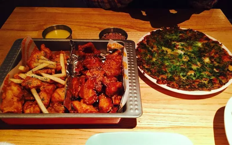 新大久保にある人気のチキン屋さん🐔チキンと言えばここって感じですね!ヤンニョンチキンとハーフ&ハーフで注文🐓一つ一つが大きなチキン。外はカリカリでジューシー。とても食べ応えがあり、大人数の方がいろんな味を試せます。透明な手袋🧤を渡され、手で食べるスタイル。他のメニューも美味しそうでした。