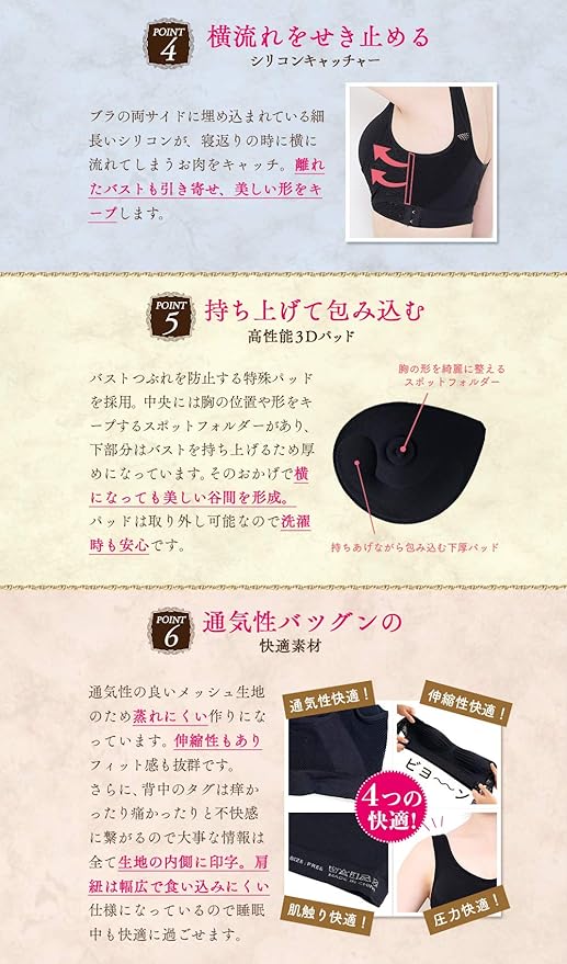 フロントホックと脇下のパワーネットにより、寝ているときに脇や背中に流れがちなバストを真ん中に寄せてキープします(※1)。肌に触れる部分はコットン100%(※2)なので、チクチクしにくく長時間着けやすいのもポイント。