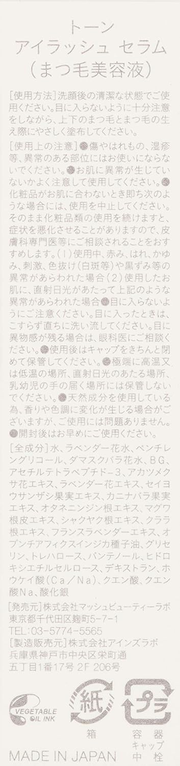 マツエクにも対応しており、1日1回のケアで良いので便利!合成香料、合成着色料、鉱物油、紫外線吸収剤、シリコン、アルコール、石油系界面活性剤、サルフェートを使用していないので、肌にも優しいです。美容成分をたっぷりと配合した、目元に優しいまつ毛美容液をお求めの方におすすめ。