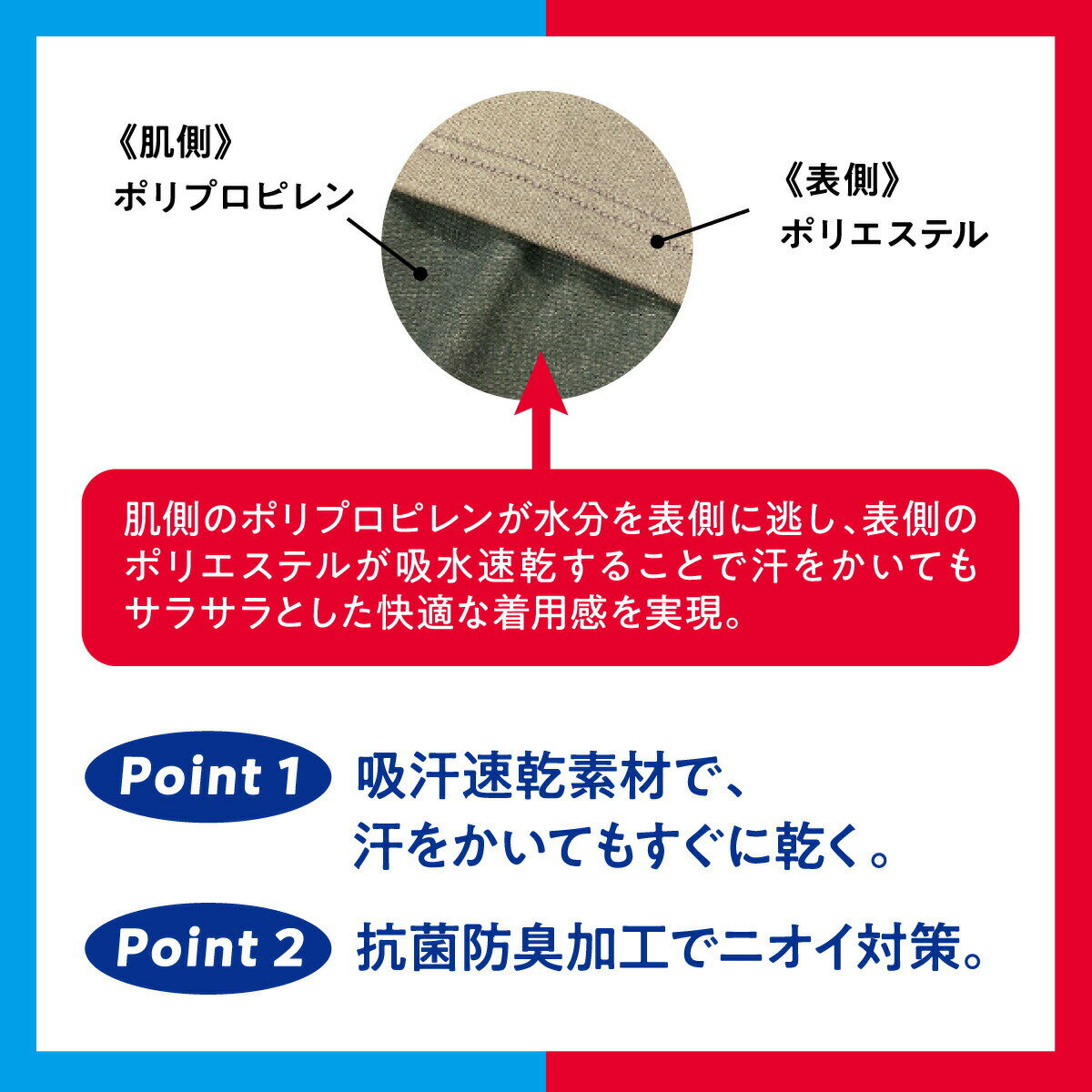生地には、汗冷えや汗ムレなどの不快感を抑える吸汗速乾素材を使用し、汗をかいてもすぐに乾きやすいのが特徴です。抗菌防臭加工を施されており、臭い対策もできます。