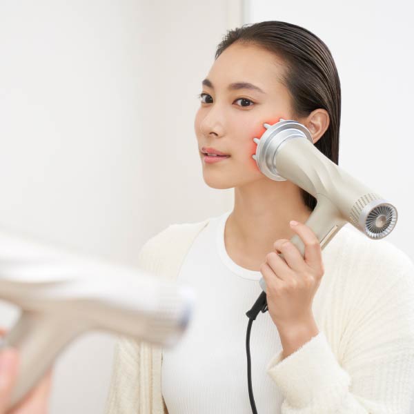 美顔器機能では、温熱+音波振動+イオン導入+赤色LEDを同時出力し、顔や頭皮に心地良く刺激を与えるのが特徴。髪を乾かすついでに顔と頭皮のケアがしっかりできるので、忙しくて美容に時間をかけられないという方にもおすすめです。