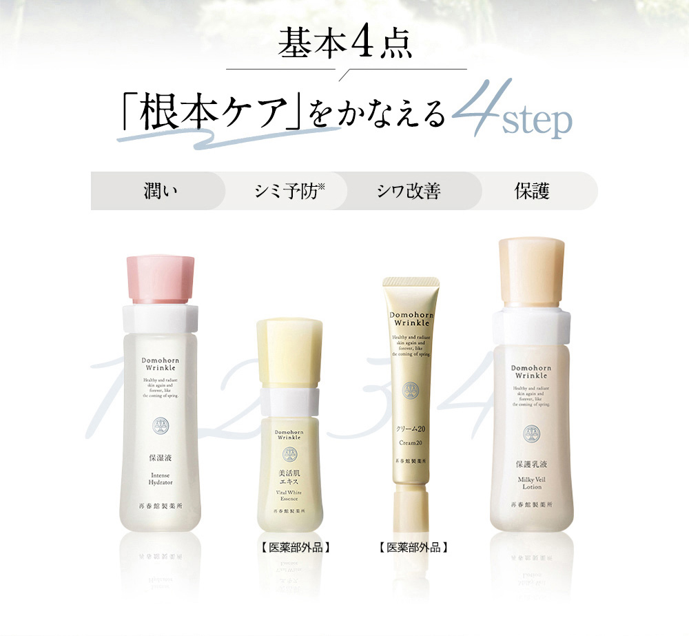 | 内容 | 化粧落としジェル 洗顔石鹸 泡の柔肌パック 保湿液 美活肌エキス(※1) [医薬部外品] クリーム20(※2) [医薬部外品] 保護乳液 光対策 ドレスクリーム (※1) 販売名:ドモホルンリンクル 薬用美容液b (※2) 販売名:ドモホルンリンクル 薬用クリームb |
