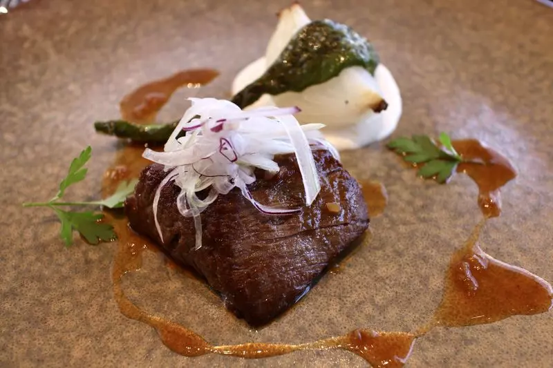 肉料理のヴィアンドは富良野和牛のフィレと伊達産たまねぎのロースト。