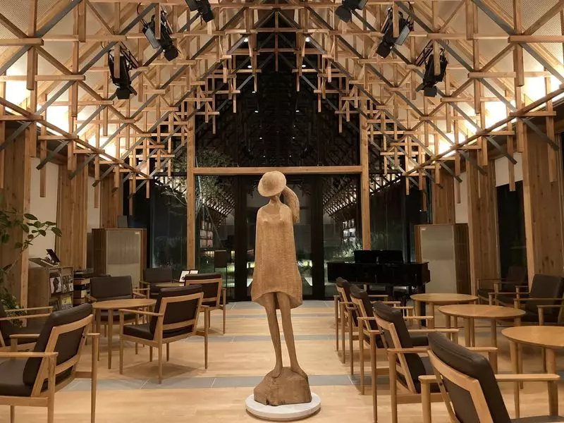 印象的な少女の彫刻や窓の外には水盤に浮かぶ鹿の芸術品。