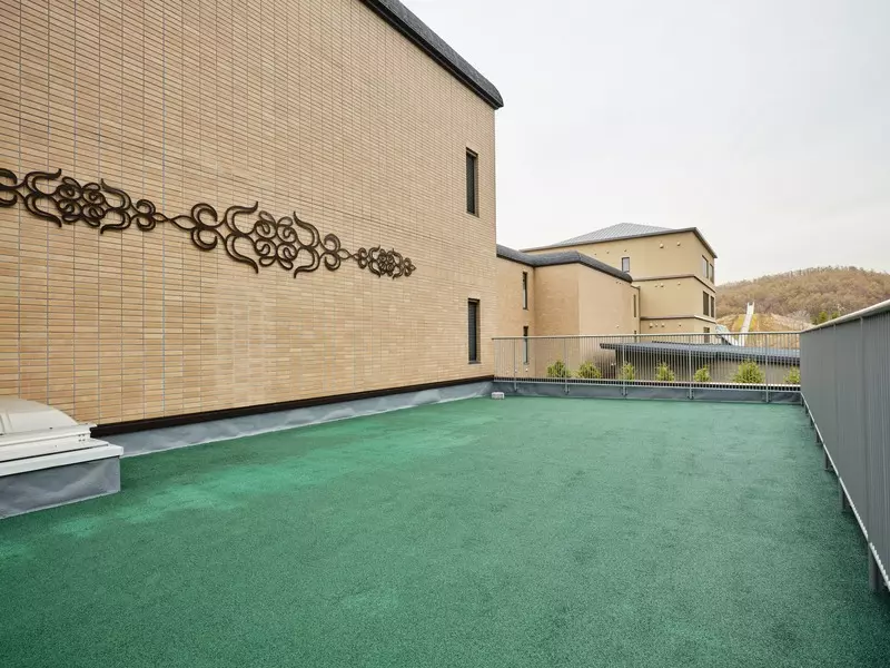ラウンジから庭、展望台へつづく階段はアイヌの神々が住むと言われる神聖な真東の方角。