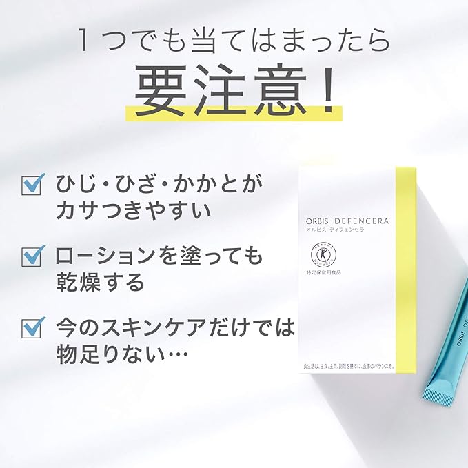 オルビスの「ディフェンセラ」は、飲むだけで肌の水分を逃しにくくし、潤いを保ってくれるのが魅力!水なしで飲めるパウダータイプなので、いつでもどこでも服用できます。