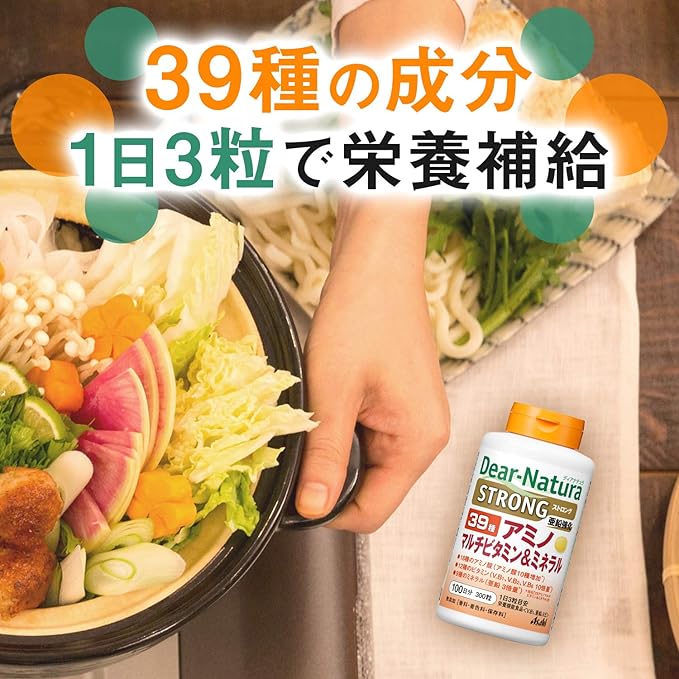 ディアナチュラの「ストロング39アミノ マルチビタミン&ミネラル」は、ビタミンB1やビタミンE、亜鉛を豊富に配合している栄養機能食品。他にも葉酸やカルシウムなども摂取できます。