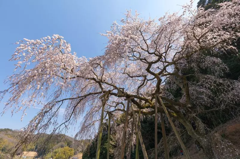 1,300年前に持統天皇が植えたとされるしだれ桜は、市の天然記念物にも指定されています。高さ17mから流れ落ちるように咲き誇る桜の花は、圧巻です。
