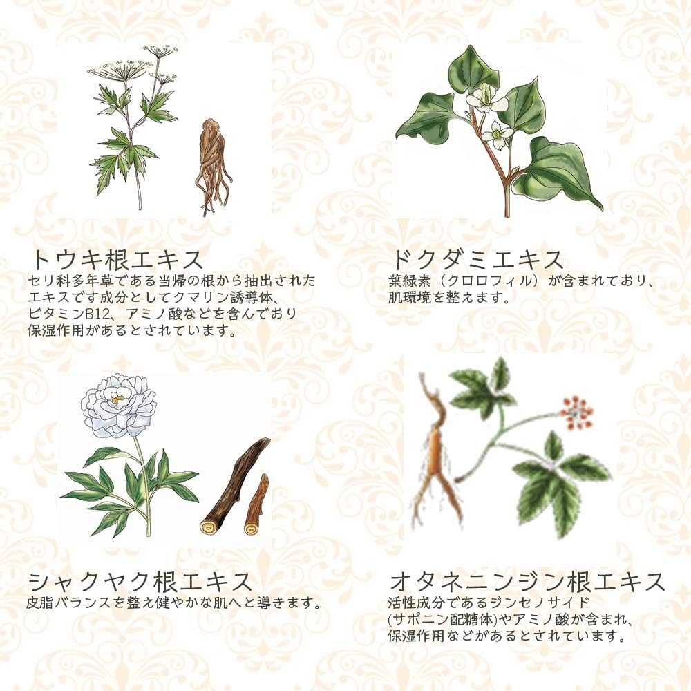 ※ゴツコラ(保湿)、菊(保湿)、よもぎ(キメを整える)、スギナ(ハリを与える)、桑(ハリを与える)