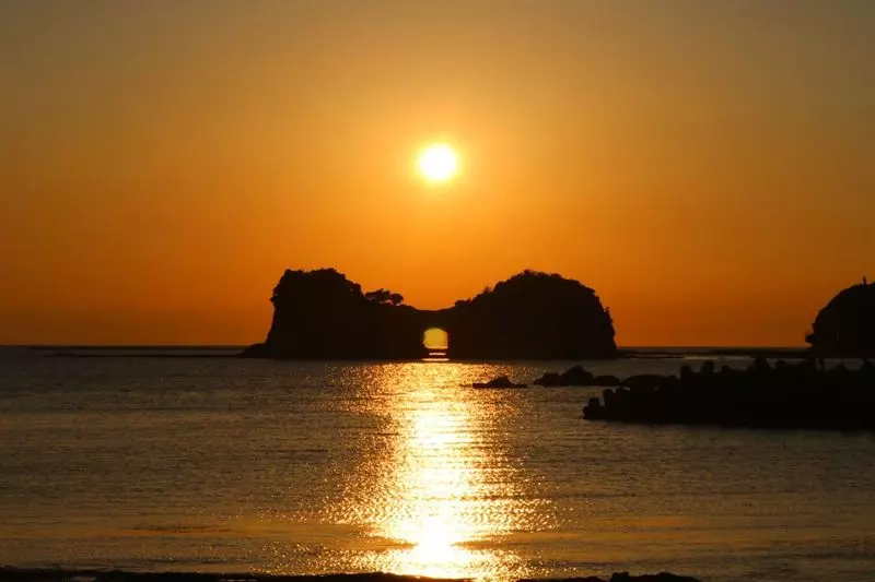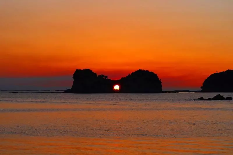 「和歌山県の夕陽100選」にも選ばれている【円月島】(※“白浜町ホームページ”より抜粋)。