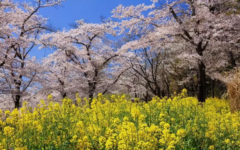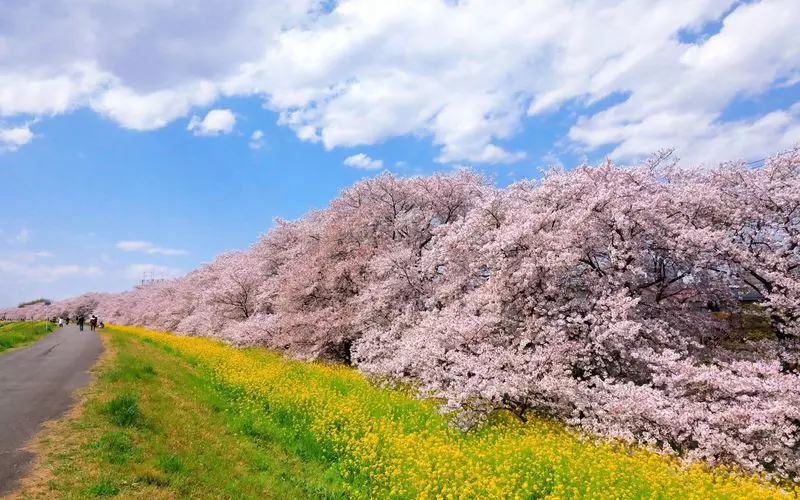 堤には約1kmに渡って約1,000本の桜が咲き誇ります。その隣には鮮やかな黄色が美しい菜の花が♡桜の淡いピンクと菜の花の黄色のコントラストは圧巻の景色です!晴れた日にお花畑の中を散歩しながら花見を楽しめば、とっても良い休日になりそう♪