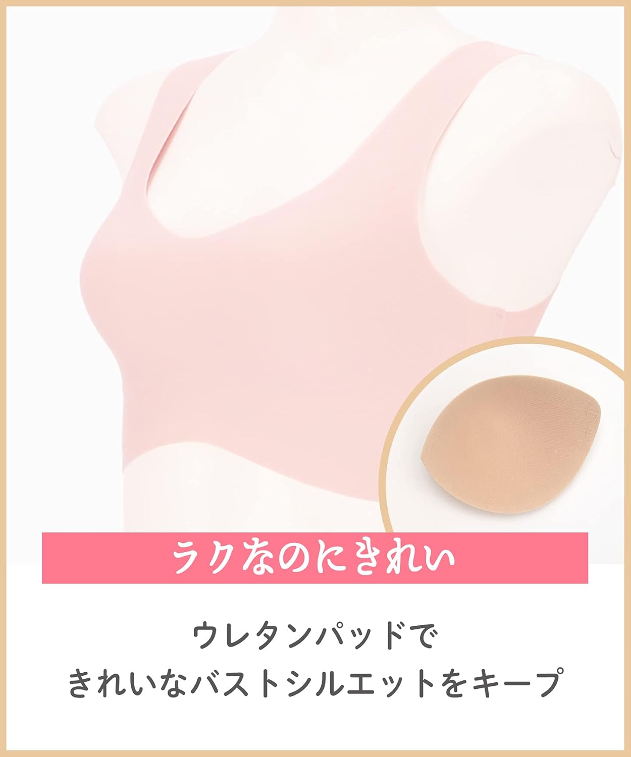 丸みのあるウレタンパッドが入っており、バストをしっかりとセンターに収めます。また、吸水速乾性のある素材を使用しており、汗ばむ夏の着用におすすめなのもうれしいポイントです。