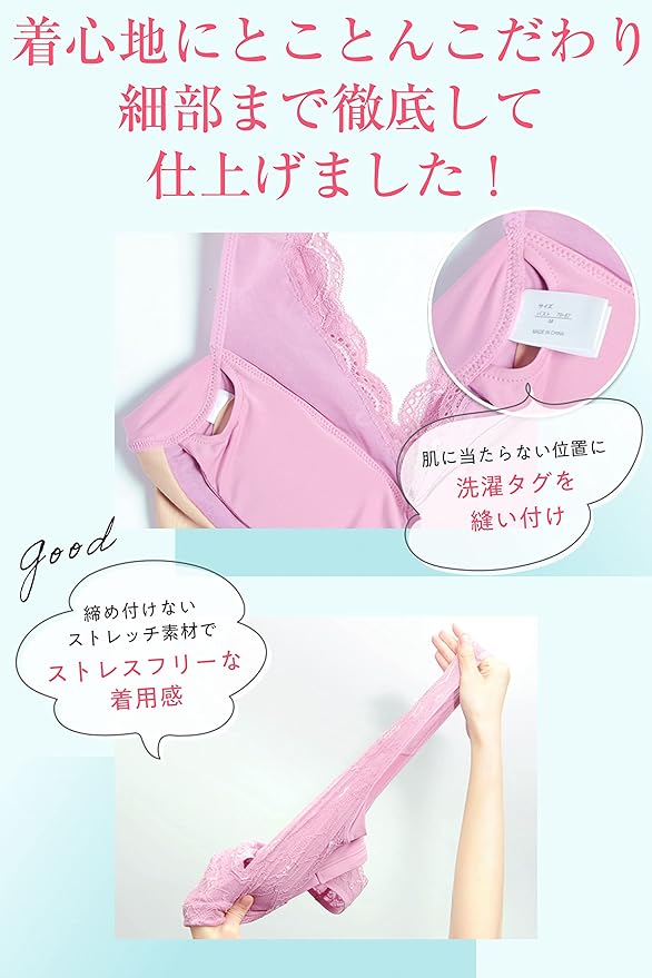 | 素材 | 身生地:ポリエステル100% レース:ナイロン90%/ポリウレタン10% 裏部分:レーヨン95%/ポリウレタン5% |