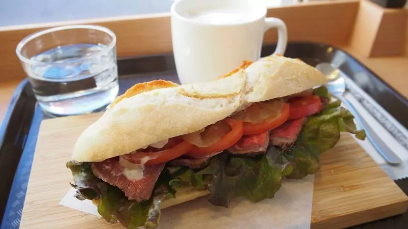 写真はバゲットの「ローストビーフサンド」と「カフェラテ」。