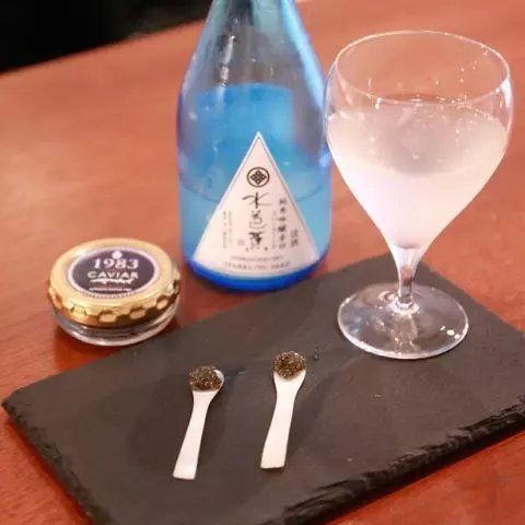 なんとこちらでのお通しは宮崎県産のチョウザメのキャビアと日本酒スパークリングのセットなんです!