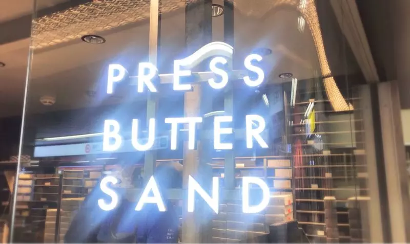 小さいですが、スタイリッシュでおしゃれな店構えが存在感漂わせています。ここはバターサンドの専門店です。(※"PRESS BUTTER SAND 公式HP"参照)