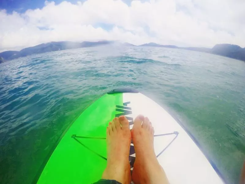 SUPのボードはサーフボードと比較すると浮力が高く安定しており、初心者でも乗り方を教えてもらって数分練習するとコツを掴めます。