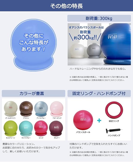 こちらのバランスボールの耐荷重は約300kg(※)。耐久性がばっちりなのも、うれしいポイントです。