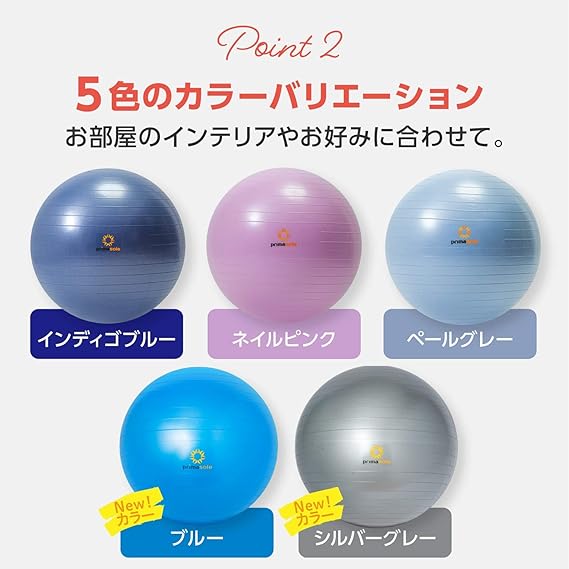 続いて紹介するのは『Primasole(プリマソーレ)』の「フィットネスボール」。45cm、55cm、65cm、75cm(※)の4つのサイズから選べます。カラーバリエーションも5色展開(※)と豊富です。