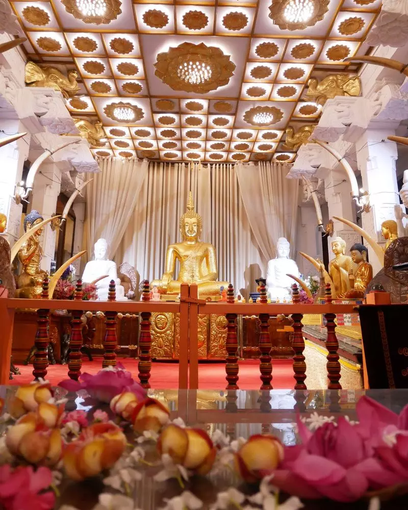 たくさんの人々がお花を献花している先に、宝石がちりばめられた金色に光り輝く小箱に納められた仏歯があります。