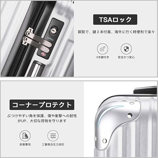 TSAロック(※)はもちろん、キャスターストッパーも搭載しているので、揺れる電車内やエスカレーターでの移動時にも利用しやすいスーツケースです。