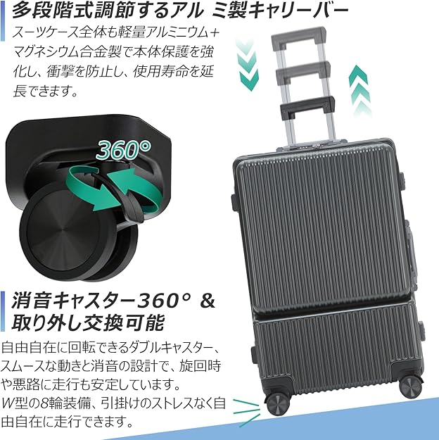 とくにビジネス用としておすすめしたいスーツケースで、ノートPCと書類などが収納できるフロントポケットが付いており、メインルームの容量を圧迫しません。機内持ち込み可なのもうれしいポイントの1つです。