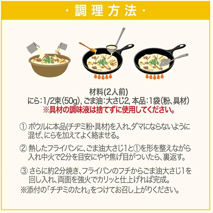 こちらには3種類の野菜が入った調味調とたれが付いており、チヂミ粉と具材を混ぜて焼くだけ!韓国の本格的なチヂミを自宅でも簡単に作れます。キムチや海鮮を入れて、チヂミのアレンジメニューを楽しむのもおすすめです。