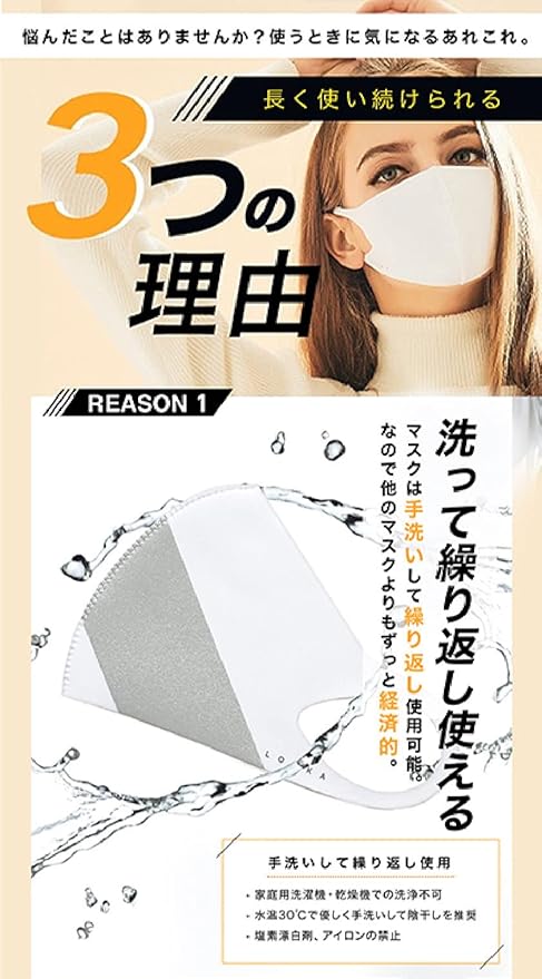 柔軟な素材を使用しているため呼吸がしやすく、付け心地がよいのが特徴!サイズやカラーが豊富に用意されているので男性はもちろん、女性や子どもでもおしゃれに着用でき、洗濯して繰り返し使えます。