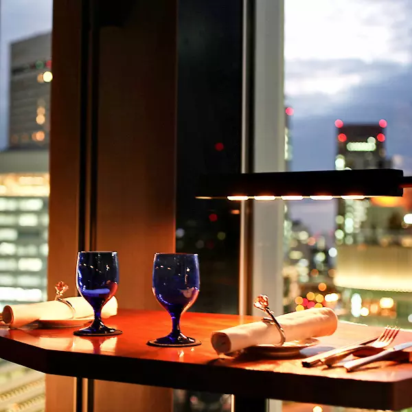 大きな窓からは大阪市内の夜景と赤い『HEP FIVE(ヘップファイブ)観覧車』が見え、すてきなひとときを過ごせます。