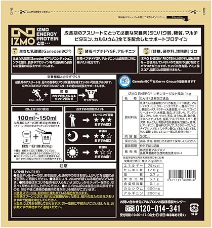 続いてご紹介するおすすめのジュニアプロテインは、アルプロンの「IZMO ENERGY プロテイン」です。成長期のアスリート向けに作られてプロテインで、トレーニング後に吸収されやすいホエイプロテインが配合されています。