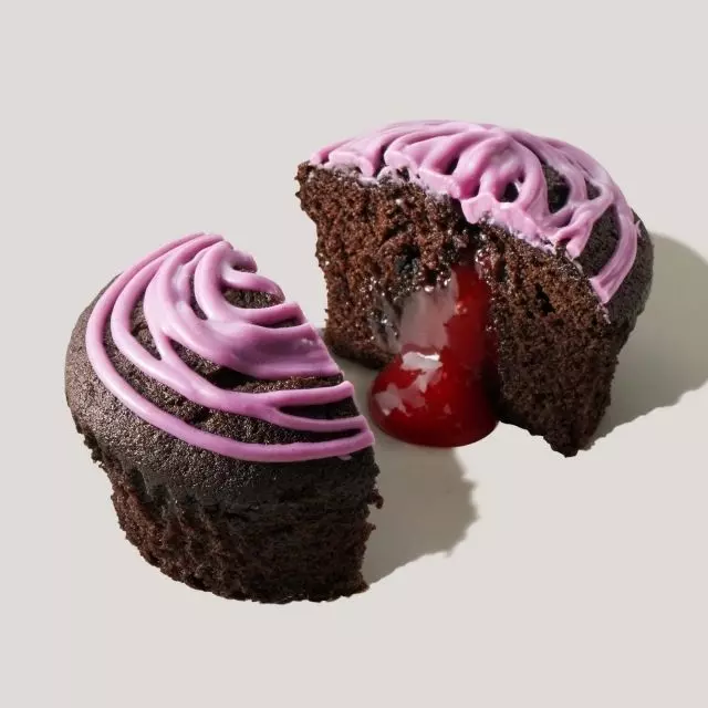 あやしげな紫色のコーティングが目を引くチョコレートケーキです。コーティングには甘酸っぱいブルーベリーパウダー入り。さらにケーキを温めると、中から赤いラズベリーソースがとろりと出てくる楽しい仕掛けです。