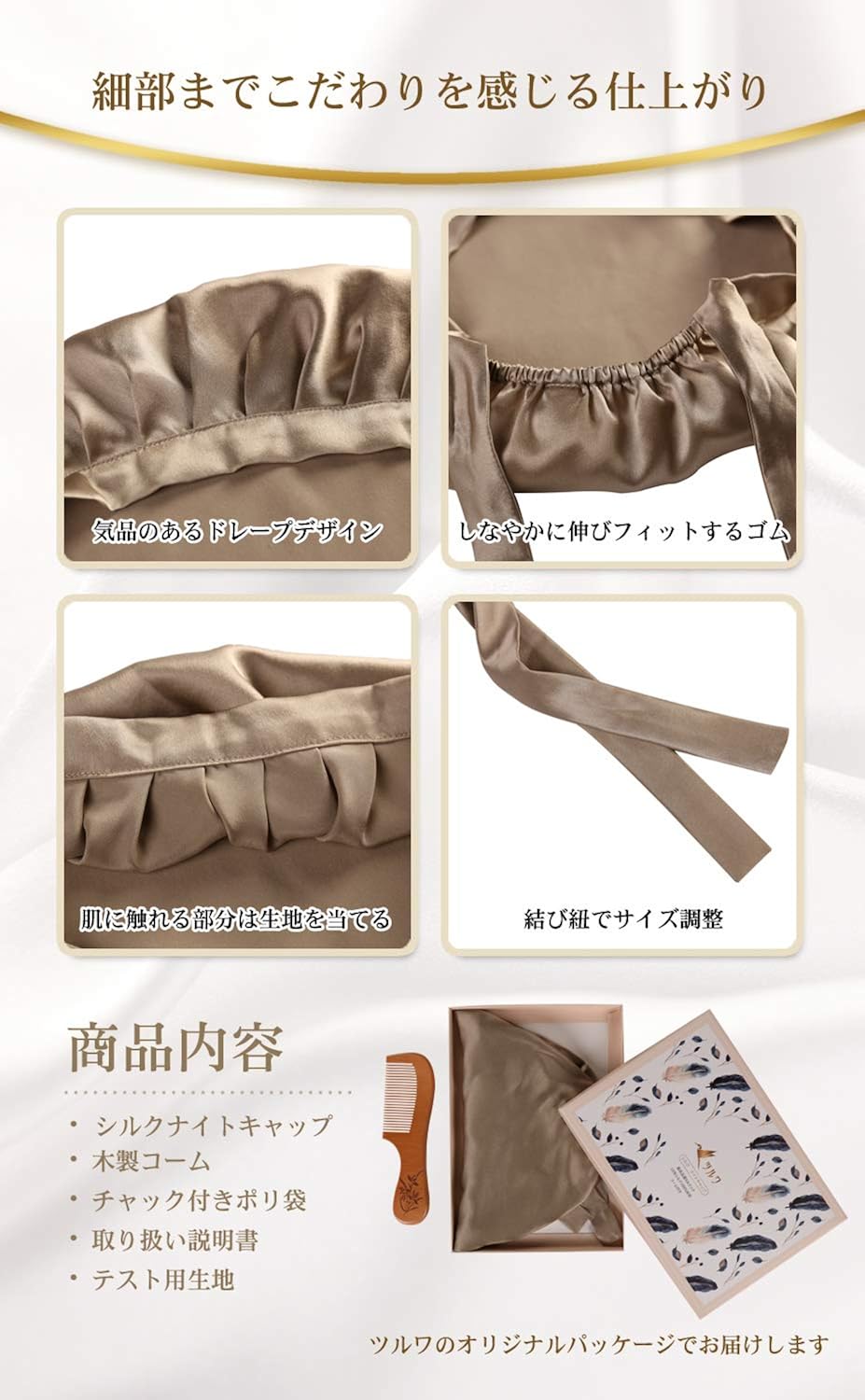 『ツルワ』の「ナイトキャップ」は、高級感あふれる光沢感と、いつまでも触れていたくなるような肌触りで、睡眠中の髪の乾燥を防ぎます。