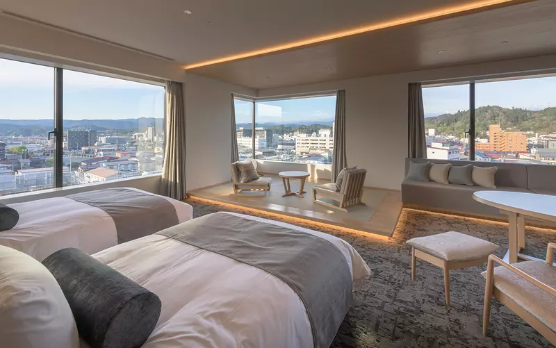 インテリアのレイアウトは、景観をゆったりと眺められるように配置された、ナチュラルなデザイン。ツインルームやダブルルーム、和洋室など全7タイプ101室(※)あるので、家族旅行でもカップルでの2人旅でもシーンを選ばず利用できます。