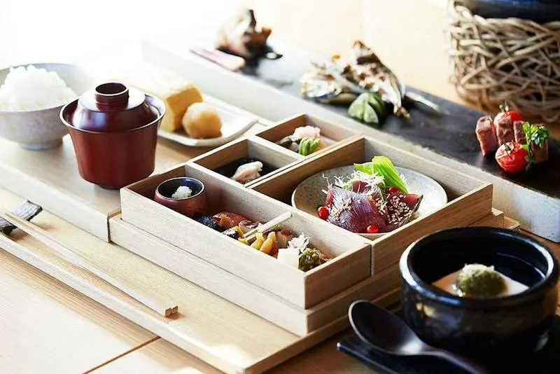 松阪牛や新鮮な魚介類、フレッシュな野菜や果物をぜいたくに使用した日本料理が楽しめます。朝食では伊勢をイメージした白木箱に、地元食材をふんだんに使った料理が並べられているのが魅力。