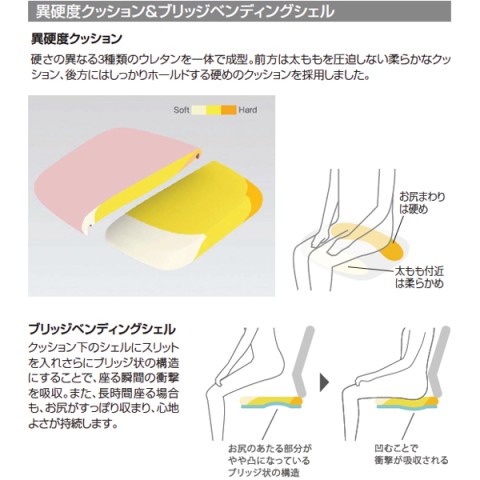 シンクロリクライニング機能、座面に3種類のウレタンを組み合わせた異硬度クッションを採用(※)。座面右下のレバーでリクライニングの強弱や高さ、奥行きを調節できます。