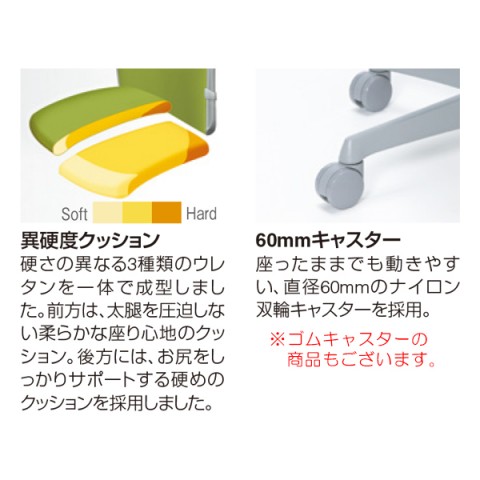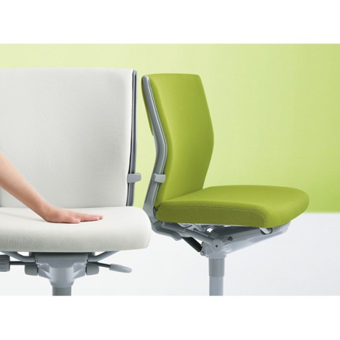 座面のクッションは、硬さの異なる3種類のウレタンが使用され長時間座っていても疲れにくい座り心地。背ロッキング機能、高さ調節が可能な座面上下機能などワーカーの身体のことを考えられたオカムラ独自設計になっています。