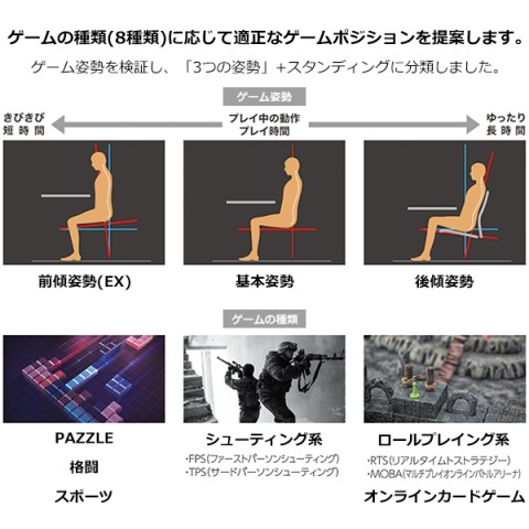 オカムラのゲーミングチェア。様々なゲームの種類によって異なる姿勢をサポートします。
