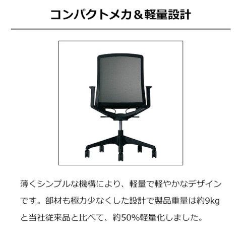 部品を極力減らし本体重量が9kgと軽量化を実現(※)した「CYNARA(シナーラ)」。アンクルチルトリクライニング機能を搭載(※)、座面下のレバーで位置を固定できます。背もたれにメッシュを採用、通気性が高いので長時間の作業も可能です。