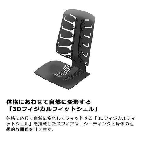 「Spher(スフィア)」は、3Dフィジカルフィットシェルを搭載し、大柄な人から小柄な人まで、さまざまな体格に自然にフィットするのが特徴です。細かい調整は不要で、チェアが利用者の体格に合わせて自動で形状を変えてくれるのがうれしいポイント。