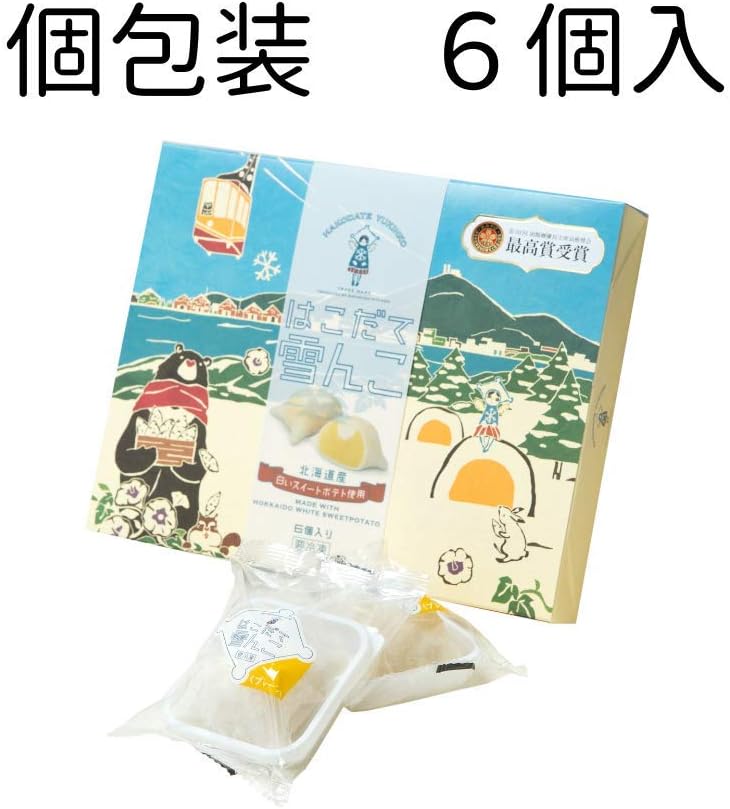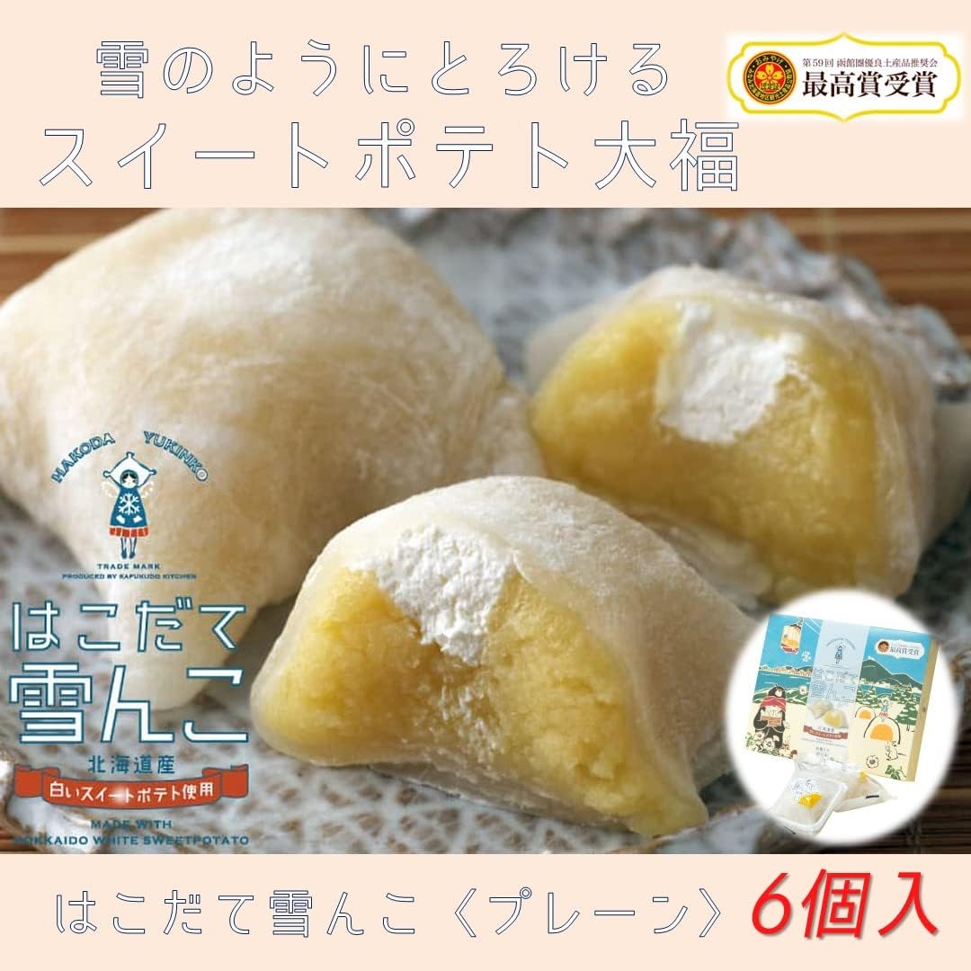 北海道産の素材をふんだんに使用した『嘉福堂キッチン』の「はこだて雪んこ」は、ふわふわのお餅で白いスイートポテト包んだ新感覚スイーツ。まるで新雪のようなふわふわ食感で、おいもの優しい味わいがふんわりと口の中に広がります。