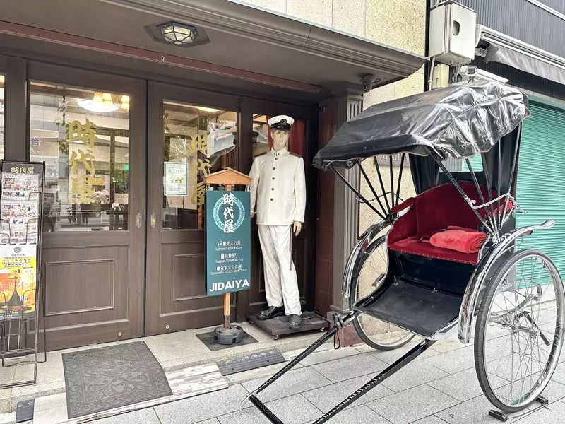 時代を感じる引き戸や制服を着たマネキン、人力車が出迎えてくれる印象的なお店です。