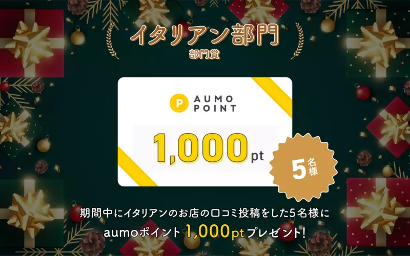 期間中にイタリアンのお店の投稿をした人の中で素敵な投稿をした5名様にaumoポイント1,000ptをプレゼント!