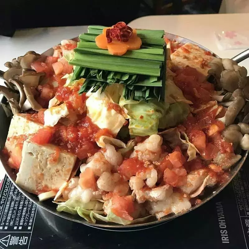 三味(333)の「元祖トマトもつ鍋」1人前1,100円(税込)。フレッシュトマトを使ったスープの中に新鮮野菜と国産もつが入っています。あっさり鍋が好きな方におすすめです!