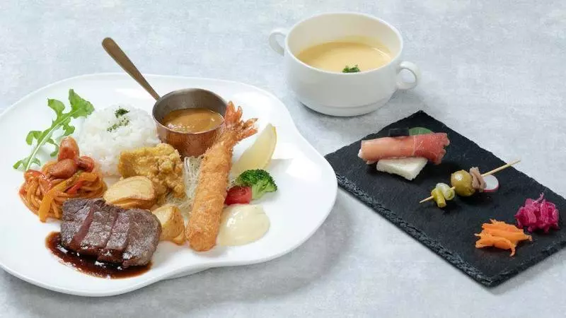エビフライやこんもりしたライスなど、お子さまランチのワクワクするようなビジュアルはそのままに、本日のオードブルまでサイドについてくるのがニクい演出です。
