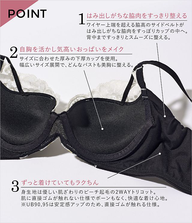 こちらのブラジャーは、脇肉を抑えて両脇をすっきりと見せてくれる脇高設計(※)!幅広のストラップでずれにくく、食い込みを軽減してくれるのもうれしいポイントです。
