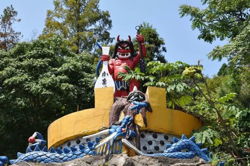 「海地獄」や「鬼石坊主地獄」から車で約3分、徒歩約8分のところにあります。鬼の像が印象的な「かまど地獄」は、高温の温泉が噴気とともに湧き出ています!