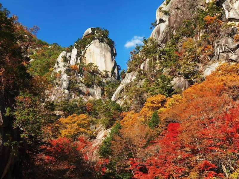 水力によって岩が削られ自然に作り出された景観は圧巻!渓流の青と紅葉の赤が対照的で、大迫力の自然を満喫できます。