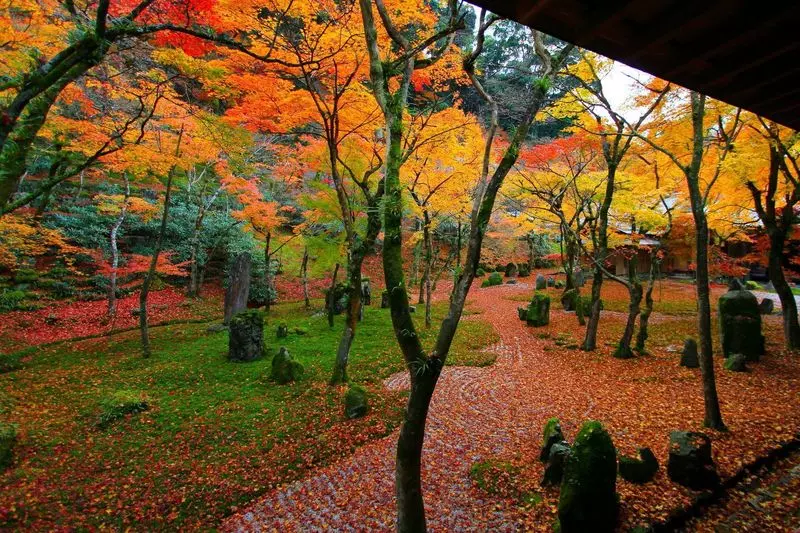 「光明禅寺」の魅力は庭園と紅葉の多さ!写真から見てわかるように紅く色づいた紅葉が庭園一帯を覆っています。まるで紅い絨毯(じゅうたん)のよう!また紅葉の周りを覆っているコケも魅力的です。