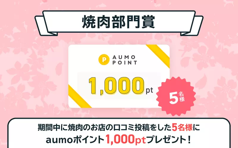 期間中に焼肉のお店の投稿をした人の中で素敵な投稿をした5名様にaumoポイント1,000ptをプレゼント!