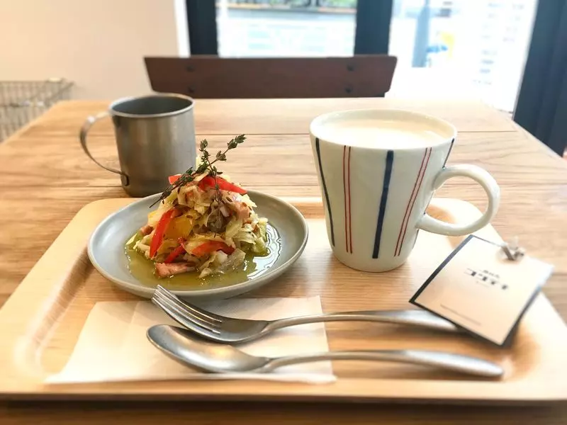 こちらは別日にいただいた「キャベツサラダ」と「チャイ(HOT)」。交差点を眺めながらのティータイムです♪
